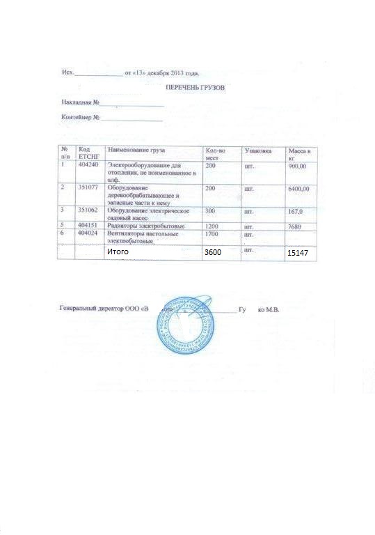 При перевозке "сборного груза", состоящего из более 2 наименований, Вам необходимо оформить и направить ответственным сотрудникам компании перечень грузов , оформленный по образцу.