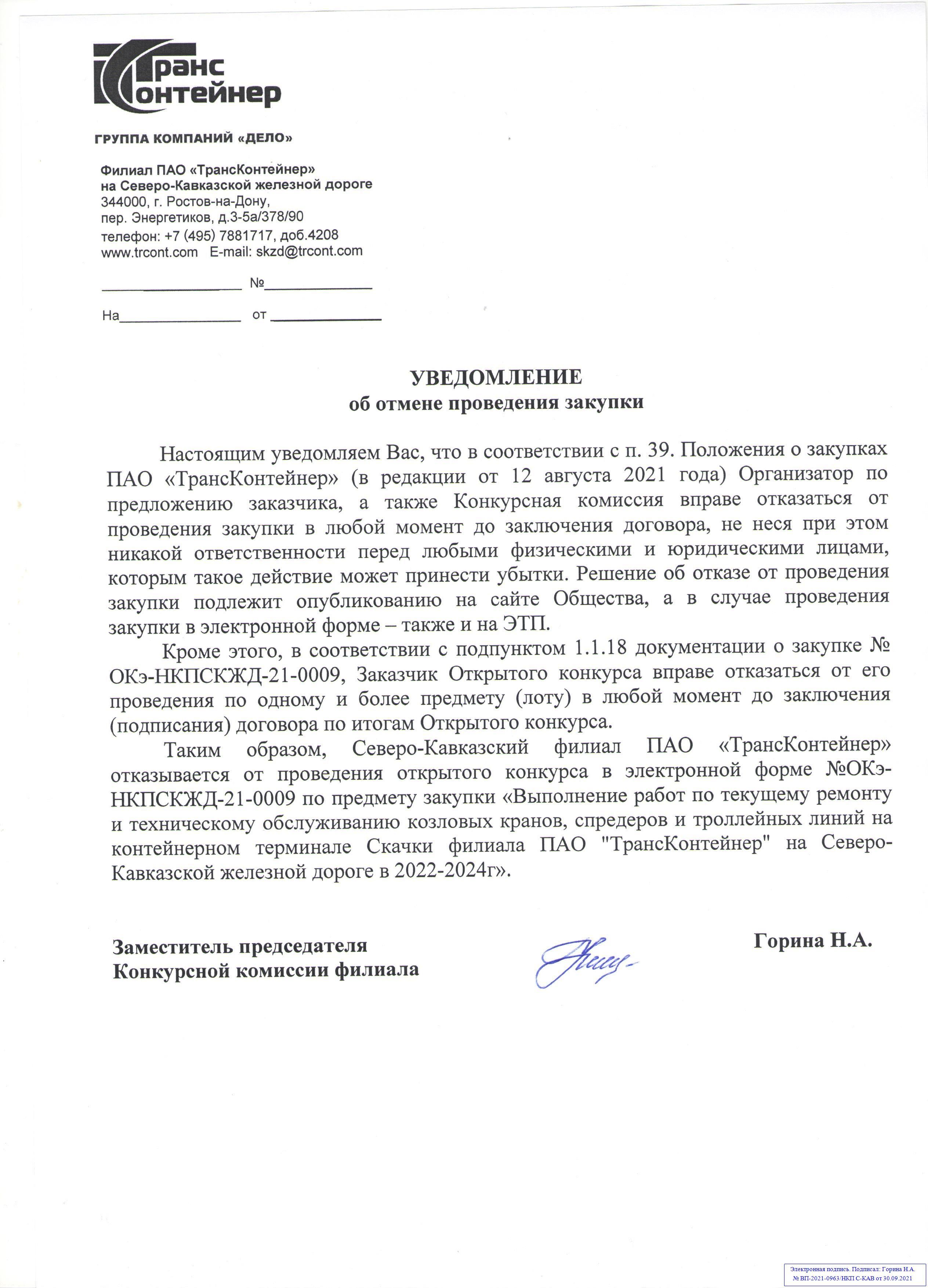 Открытый конкурс в электронной форме № ОКэ-НКПГОРЬК-21-0008 по предмету закупки «Выполнение работ по капитальному ремонту козлового контейнерного крана МККС - 42К на контейнерном терминале Лагерная филиала ПАО «ТрансКонтейнер» на Горьковской железной дороге».